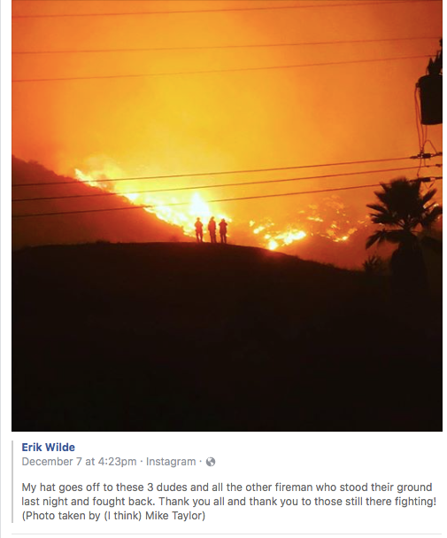 “My hat goes off to these three dudes and the other firemen who stood their ground,” a grateful resident Erik Wilde wrote on his Facebook page, under a photo of silhouetted firefighters.