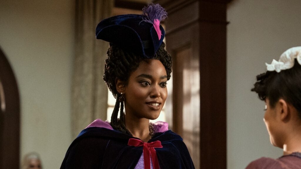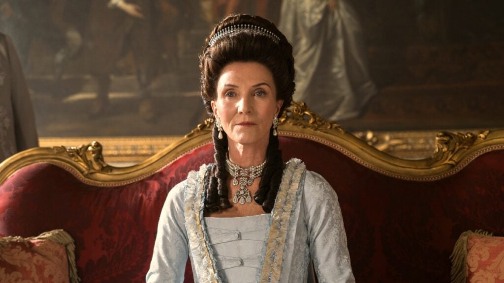 Shocked by how “brown” Princess Charlotte is, the King’s mother, Princess Augusta (Michelle Fairley), is the bride-to-be’s harshest critic. Concerned, but not wanting to postpone the wedding, the Dowager Princess devises a plan she dubs “The Great Experiment.” She hastily bestows titles on many of the ton’s Black and brown residents, and then invites them to the royal wedding seated across the aisle from white members of the aristocracy.