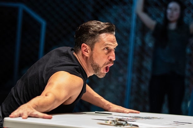 Esparza’s Arturo Ui keeps his eyes wide shut, plus he exudes rank stupidity. The character’s most violent harangues, and there are many, often spring from the campiest of retorts. One moment, Esparza is stuck wallowing in Arturo Ui’s seemingly playful narcissism; the next, he’s a fire-breathing monster in full command. It’s a magnificently indulgent performance.