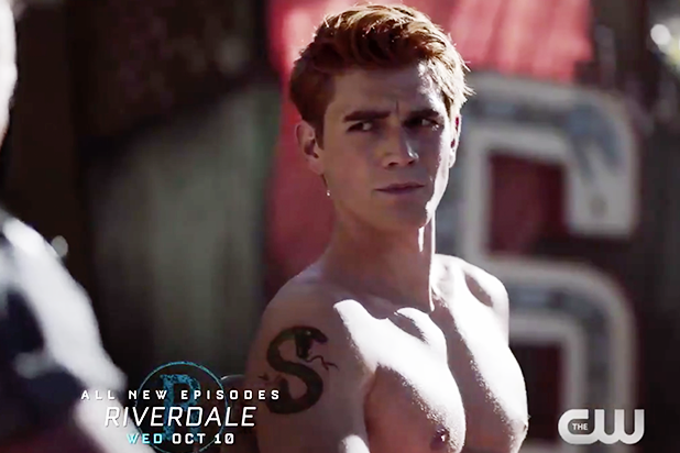 We’re also treated to a shirtless shot of Archie who seems to be sporting a fresh Serpent tattoo on his right bicep. Does Arch make it out of jail (there’s a shot of our small-town hero behind bars in the video) to join the Serpents?