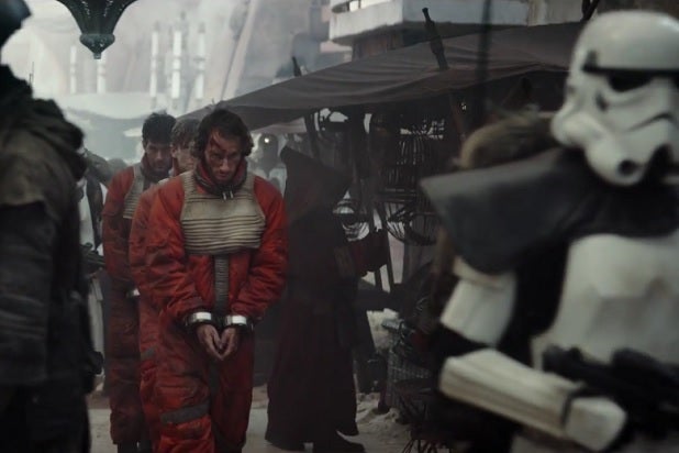 The trailer opens with a voiceover of charges against Jyn Erso, our hero. We then see a handcuffed Erso herself being led through the Rebel base in the ziggurat temple on Yavin IV. This setting should be familiar — it’s the secret Rebel base featured in the original “Star Wars.” “Rogue One” takes place prior to that film, in which the Rebels flee Yavin IV for the frozen wastes of Hoth.