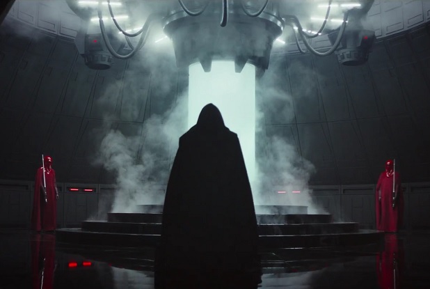 Then we see a shot of a cloaked figure kneeling before a beam of light flanked by red Imperial Guards (the folks charged with protecting the Emperor).