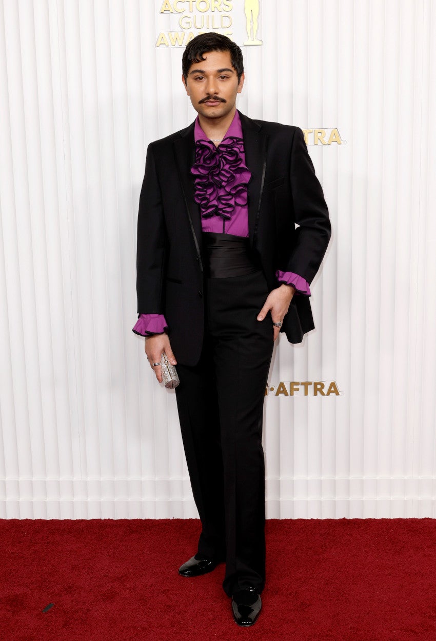 The “Hacks” actor brought flamenco flair to the carpet with a ruffled purple shirt and bejeweled accesories.