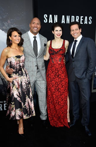Frazer Harrison/Getty ImagesStars of Warner Bros. Pictures’ “San Andreas” — Carla Gugino, Dwayne ‘The Rock’ Johnson, Alexandra Daddario, Ioan Gruffudd arrive for the film’s Los Angeles premiere on May 26, 2015.