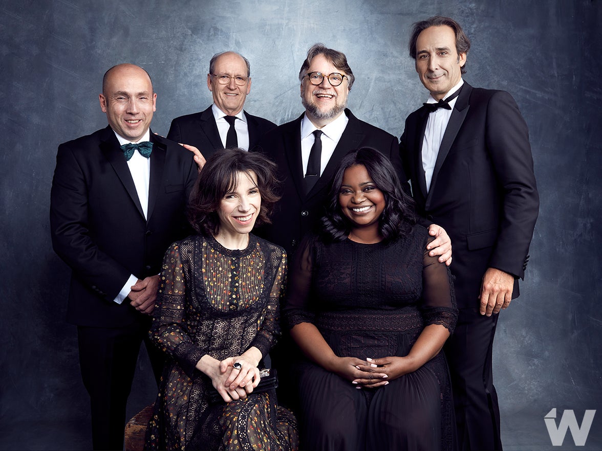 Producer J. Miles Dale, actors Richard Jenkins and Sally Hawkins, director Guillermo del Toro, actor Octavia Spencer and composer Alexandre Desplat, “The Shape of Water”