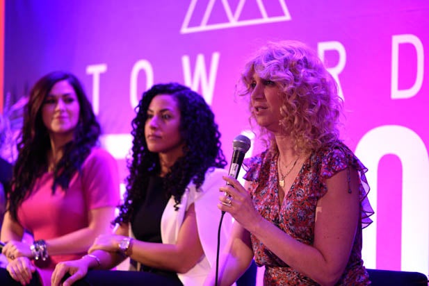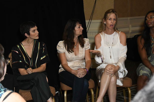 Executive and producer Erica Huggins, TV writer, producer and director Cindy Chupack and producer Cathy Schulman speak at a breakout session at the second annual Power Women Summit.