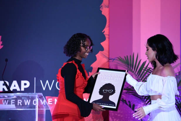 U.S. Youth Climate Strike co-founder and co-executive director Isra Hirsi accepted WrapWomen’s Voice of the Future award, introduced by singer and actress Becky G.