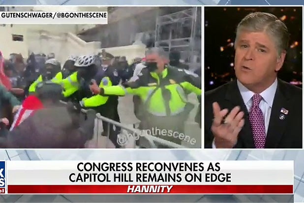 On TV, Hannity suggested the blame for the riot could belong to the more vague concept of “bad actors.” “We also knew that there’s also bad actors that will infiltrate large crowds,” he said during his opening segment. He dropped a couple more references to this idea later in the show.