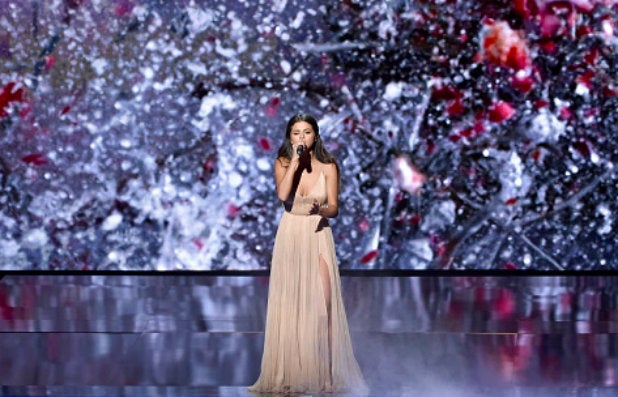 Under a single spotlight, backed by graphics of turbulent seas and falling rain, Gomez performed “The Heart Wants What It Wants.”