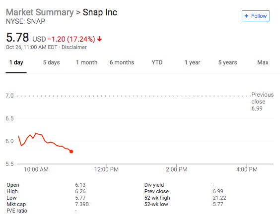 Snap shares dropped 17 percent on Friday morning, falling below the $6 per share mark for the first time. Snap’s stock, since opening the year near $15 per share, has cratered more than 60 percent.