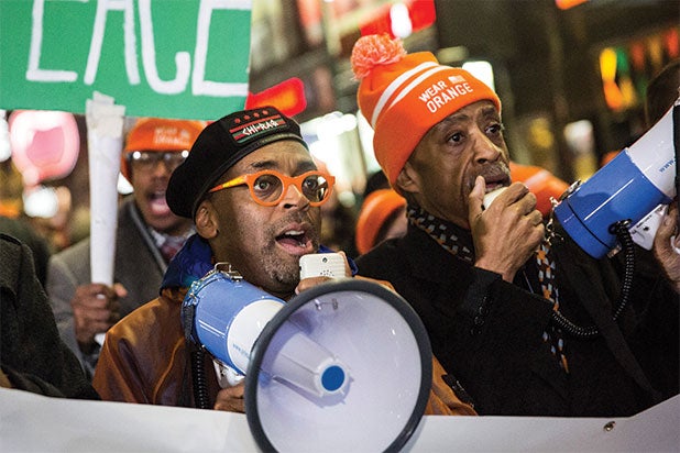 After the screening, for which Cusack, Wesley Snipes, Nick Cannon, Teyonah Parris, LaLa Anthony, Michelle Mitchenor and Harry Lennix were present, Lee handed out knit hats and orange-colored American flag pins before leading the group down Broadway.