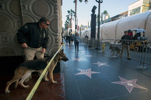 Bomb-sniffing dogs patrol the site on Hollywood Blvd.