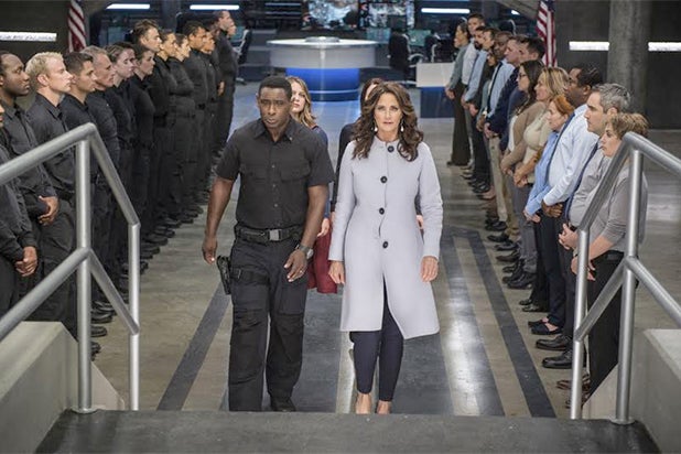 DEO director Hank Henshaw (David Harewood) and President Olivia Marsdin march through headquarters during the “Supergirl” episode airing Monday, Oct. 24.