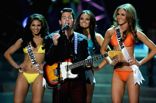 Jonas is shown performing at the 2013 “Miss USA” pageant. It’s not secret he likes beauty queens, as his current girlfriend Olivia Culpo holds a few titles.