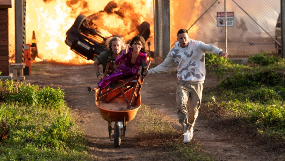 At the prompting of her publisher, Beth (Da’Vine Joy Randolph), the reclusive Loretta Sage (Bullock) reluctantly agrees to attend a convention with her cover model, Alan (Tatum). He is her fictitious character Dash incarnate — or so he and her fans think, much to her dismay. For the occasion, she dons a tight sequined fuchsia jumpsuit that gives her “wedgie in the back and in the front,” the sole purpose being to manufacture slapstick when Loretta literally struggles to sit down for a chat with the event’s moderator (Bowen Yang).