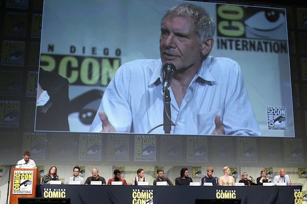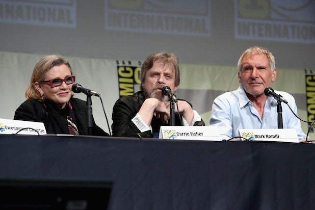 Actors Carrie Fisher, Mark Hamill and Harrison Ford at the Hall H Panel for “Star Wars: The Force Awakens” during Comic-Con