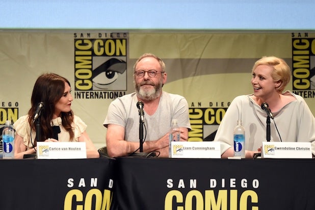 Actors Carice van Houten, Liam Cunningham and Gwendoline Christie speak at the “Game of Thrones” panel during Comic-Con