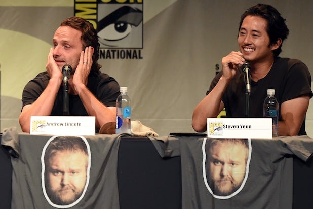 Actors Andrew Lincoln and Steven Yeun speak at AMC’s “The Walking Dead” panel during Comic-Con