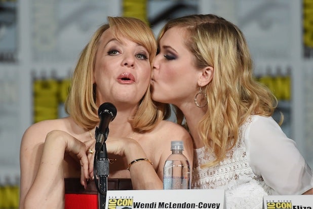 Actresses Wendi McLendon-Covey and Eliza Taylor speak onstage at TV Guide Magazine: Fan Favorites during Comic-Con