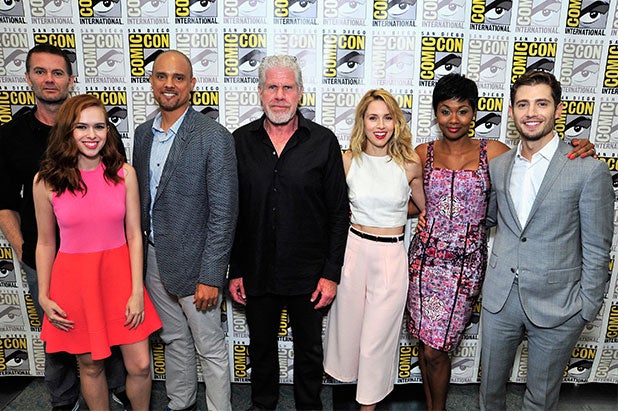 Actors Garret Dillahunt, Elizabeth Sarah McLaughlin, creator Ben Watkins, actors Ron Perlman, Alona Tal, Emayatzy E. Corinealdi and Julian Morris attend Amazon Original Series “Hand of God” Panel And Signing on July 9, 2015