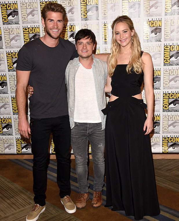 Jennifer Lawrence, Josh Hutcherson and Liam Hemsworth in the Lionsgate press room at Comic-Con 2015