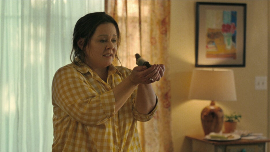 The bird is eventually brought down to earth, but it’s not the only one. Also grounded are Lilly (Melissa McCarthy) and Jack (Chris O’Dowd), who are still reeling from the loss of their baby daughter a year earlier. Jack seems to have been hit hardest, since he’s living alone in a mental health facility that Lilly visits weekly for family therapy sessions. When she’s not there, she works listlessly at a supermarket, gardens in their farmhouse yard, and begins therapy herself with a veterinarian named Larry (Kevin Kline). It doesn’t really make sense that Larry is also a psychologist, but it’s convenient because Lilly quickly develops a relationship with the starling in her garden.