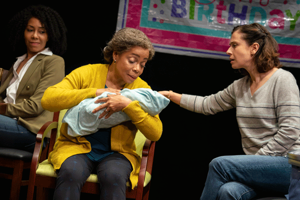 It’s the core problem with this “La Ronde” format, and Kenny Leon’s direction never solves it. Instead, he emphasizes the rigid structure rather than loosening it up. Arnulfo Maldonado’s set design delivers several distinctive locales, each one divided by a blackout (lighting by Dede Ayite) and/or a lowered curtain. It’s as if Leon and his designers have set up a metronome on stage to give each scene the same rhythm, the same dramatic weight. Playing the older Chris, the actors Denise Burse, Lizbeth MacKay and Charles Turner all manage to bring real gravitas to their respective portrayals.