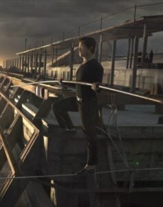 Perhaps the film’s deepest bond is the relationship that develops between Petit and Jean-Francois (César Domboy), a math teacher with a serious fear of heights. At one point, Petit and Jean-Francois (who asks Petit to call him Jeff) are stuck for a very long time on an iron beam above an elevator shaft with a sheer drop down to the ground. It has been established that Jeff is so afraid of heights that he begins to shake when they are standing just one flight above the lobby of the South Tower, so it really means something when Petit looks Jeff straight in the eyes and Zemeckis cuts to a close shot of Petit putting his hand on Jeff’s trembling hand to steady him. It’s a simple sequence that nonetheless conveys a touching level of trust and intimacy.