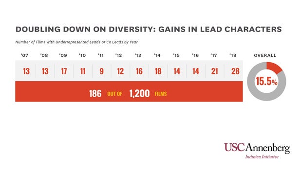 Meanwhile, 11 films featured a female lead or co-lead from an underrepresented racial/ethnic group, which was nearly three times as many films as in 2017.