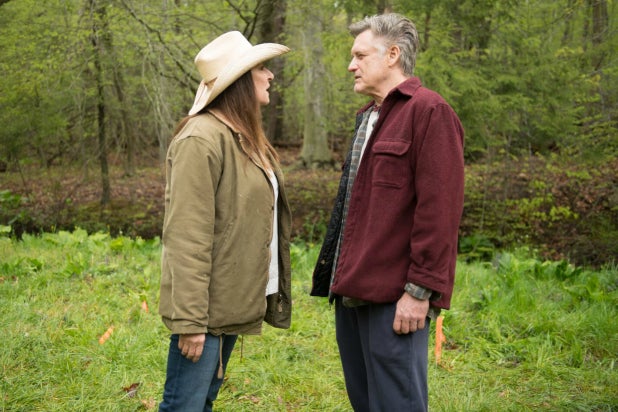 That’s due in large part to its leads: Anjelica Huston (playing against type in a cowboy hat) and Bill Pullman are Maggie and Ben, a sister and brother whose paths cross when Ben shows up on Maggie’s rural property with a backhoe. But it’s his property, he insists. Some mutual friends show up mid-scuffle; Maggie rustles up the sheriff (Brian d’Arcy James — like Huston, a veteran of Rebeck’s “Smash”). Nothing much comes of it, but Maggie’s shooed away to give Ben a chance to show the sheriff the papers he insists he has.