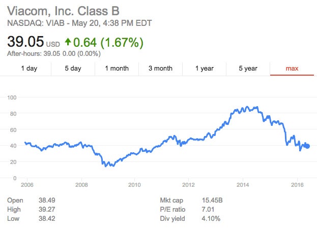 Below is a look at Viacom’s full stock history, since it spun-off from CBS in 2005. You can see the steady growth following the financial crisis almost a decade ago — right up until July of 2014, that is, when fortunes peaked and started to reverse.