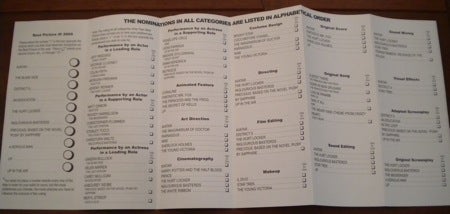 Oscar ballots (see photo above) are eight-and-a-half inches tall by about 20 inches long, and folded into six panels. The first panel contains a single category, Best Picture; the others contain three or four categories each.