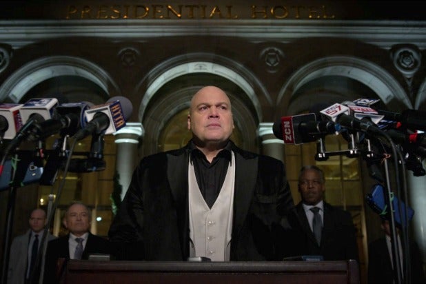 And for the most part, in Season 3 of Marvel’s “Daredevil” on Netflix, Fisk is content to work largely behind the scenes doing fun and horrifying machinations, staying several steps ahead of Daredevil (Charlie Cox), Foggy Nelson (Elden Henson) and Karen Page (Deborah Ann Woll) for almost the entire season, easily countering every move they make without taking any public action. But in the eleventh episode of season 3 he finally takes center stage and delivers a speech that you could very easily believe was written by Trump’s team.