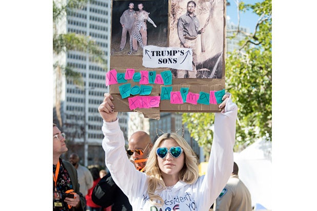 Singer Kesha joined the L.A. protest, complete with a sign criticizing Donald Trump’s sons.