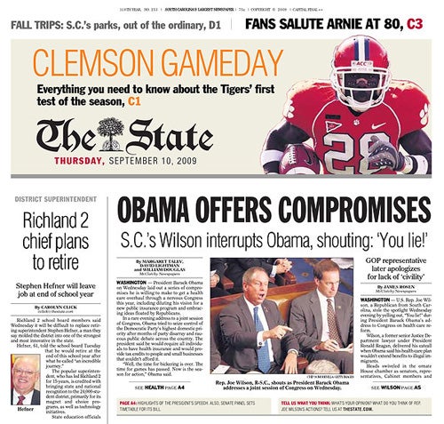 Meanwhile, as you would expect, cable news had a field day. The morning papers, however, were surprisingly subdued. The Washington Post was the only major paper to point out Wilson on its cover: